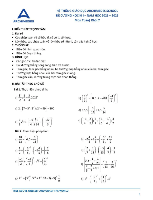 Đề cương học kì 1 Toán 7 năm 2025 – 2026 hệ thống GD Archimedes School – Hà Nội