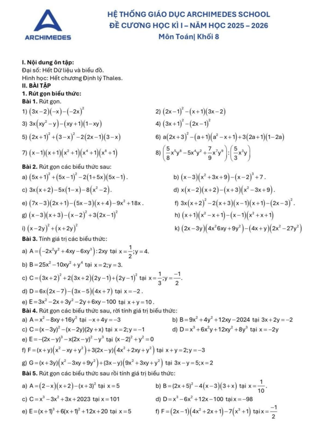 Đề cương học kì 1 Toán 8 năm 2025 – 2026 hệ thống GD Archimedes School – Hà Nội