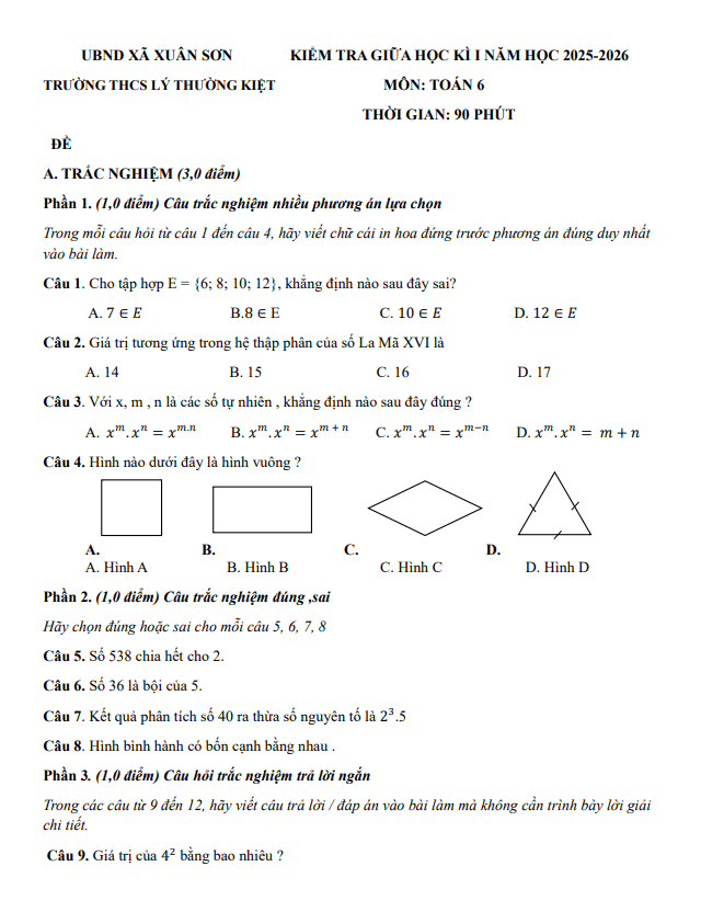 Đề giữa học kì 1 Toán 6 năm 2025 – 2026 trường THCS Lý Thường Kiệt – TP HCM