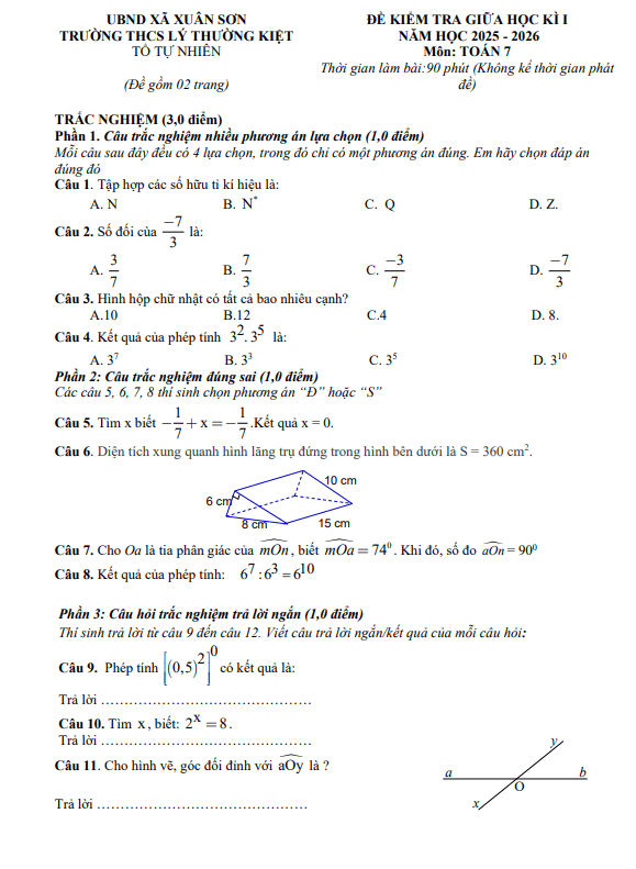 Đề giữa học kì 1 Toán 7 năm 2025 – 2026 trường THCS Ba Đồn – Quảng Trị
