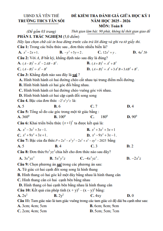 Đề giữa học kì 1 Toán 8 năm 2025 – 2026 trường THCS Tân Sỏi – Bắc Ninh