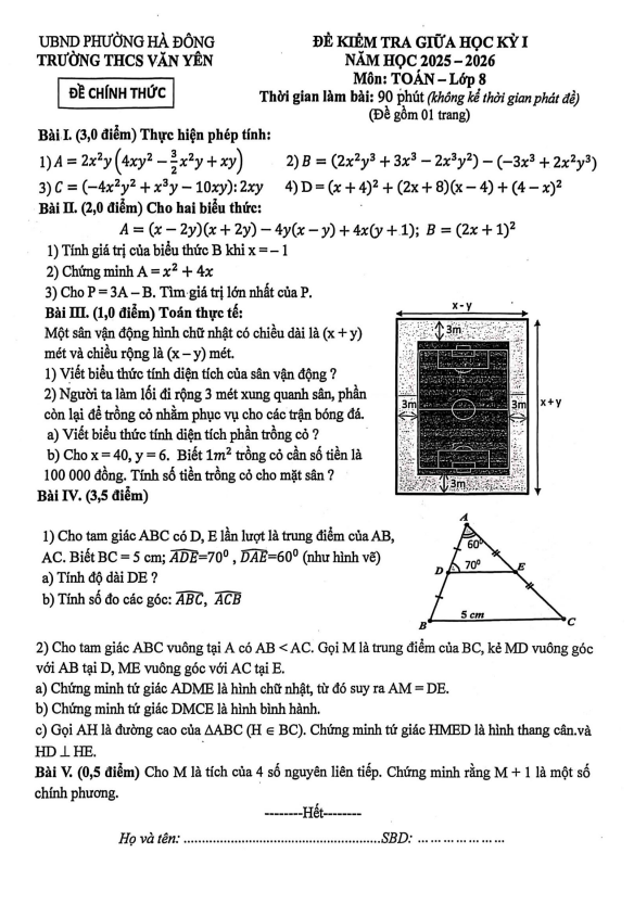 Đề giữa học kỳ 1 Toán 8 năm 2025 – 2026 trường THCS Văn Yên – Hà Nội