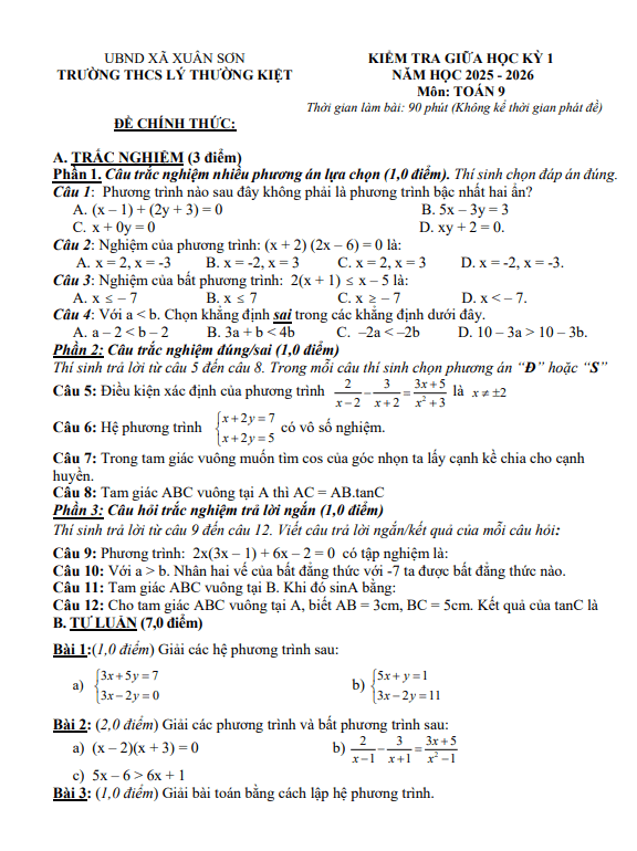 Đề giữa học kỳ 1 Toán 9 năm 2025 – 2026 trường THCS Lý Thường Kiệt – TP HCM