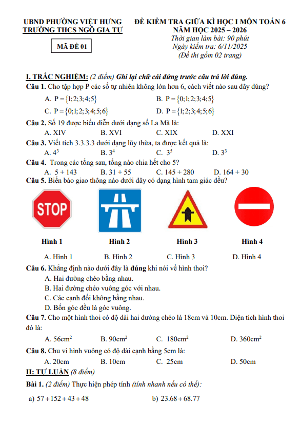 Đề giữa kì 1 Toán 6 năm 2025 – 2026 trường THCS Ngô Gia Tự – Hà Nội