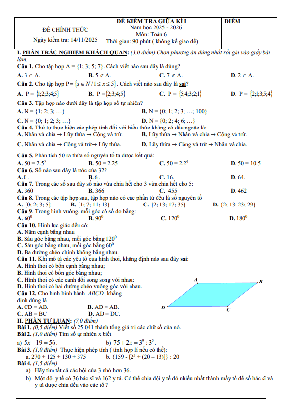 Đề giữa học kỳ 1 Toán 6 năm 2025 – 2026 trường THCS Nguyễn Gia Thiều – TP HCM