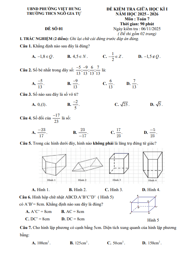 Đề giữa kì 1 Toán 7 năm 2025 – 2026 trường THCS Ngô Gia Tự – Hà Nội