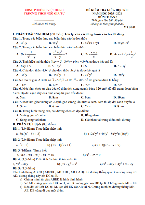 Đề giữa kì 1 Toán 8 năm 2025 – 2026 trường THCS Ngô Gia Tự – Hà Nội