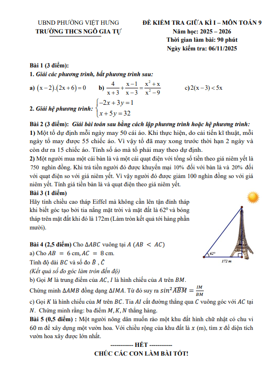 Đề giữa kì 1 Toán 9 năm 2025 – 2026 trường THCS Ngô Gia Tự – Hà Nội