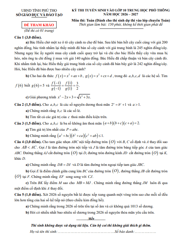 Đề tham khảo tuyển sinh lớp 10 môn Toán (chuyên) năm 2026 – 2027 sở GD&ĐT Phú Thọ