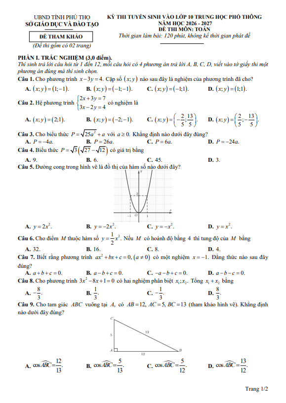 Đề tham khảo tuyển sinh lớp 10 môn Toán năm 2026 – 2027 sở GD&ĐT Phú Thọ