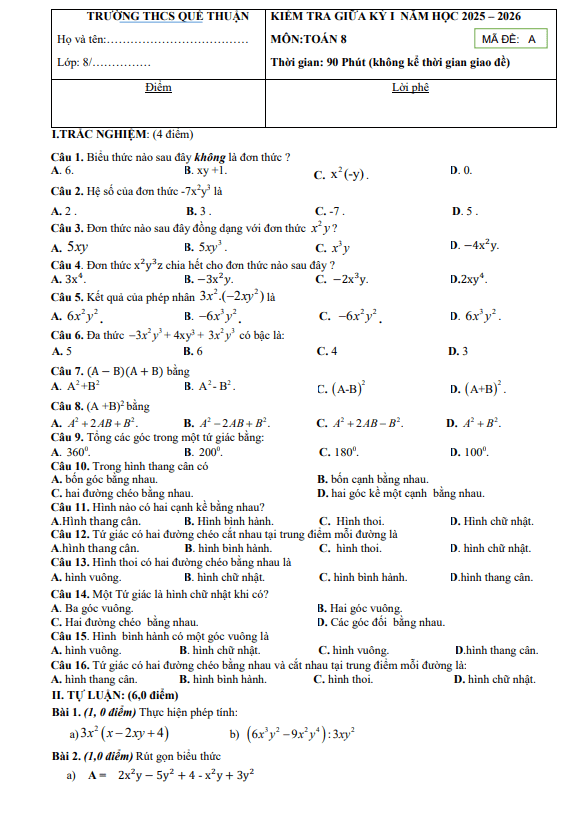 Đề Thi HK1 Toán 8 Đề kiểm tra học kỳ 1 Toán 8 năm học 2017 – 2018 phòng GD và ĐT Vĩnh Tường – Vĩnh Phúc 20/12/2017