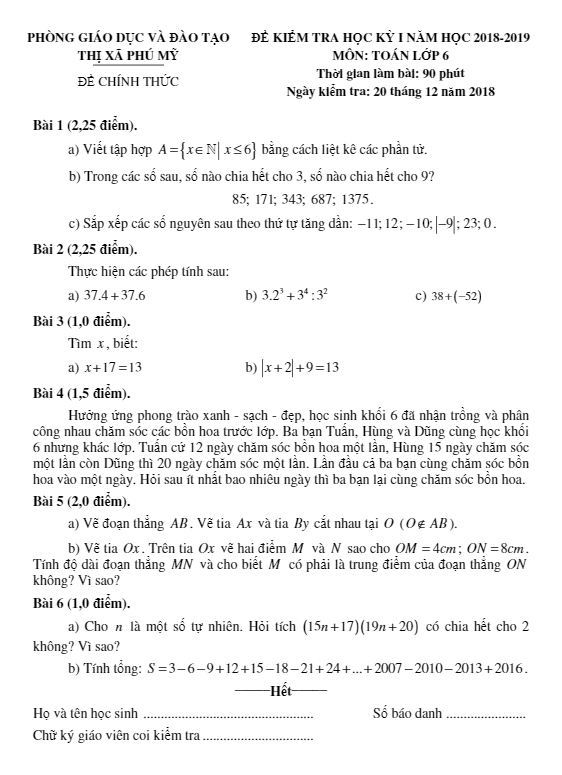 Đề Thi HK1 Toán 6 Đề thi HK1 Toán 6 năm 2018 – 2019 phòng GD&ĐT Thị Xã Phú Mỹ – Bà Rịa – Vũng Tàu 25/12/2018