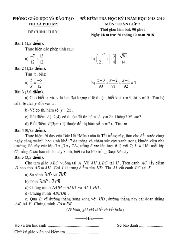 Đề Thi HK1 Toán 7 Đề thi HK1 Toán 7 năm 2018 – 2019 phòng GD&ĐT Thị Xã Phú Mỹ – Bà Rịa – Vũng Tàu 25/12/2018