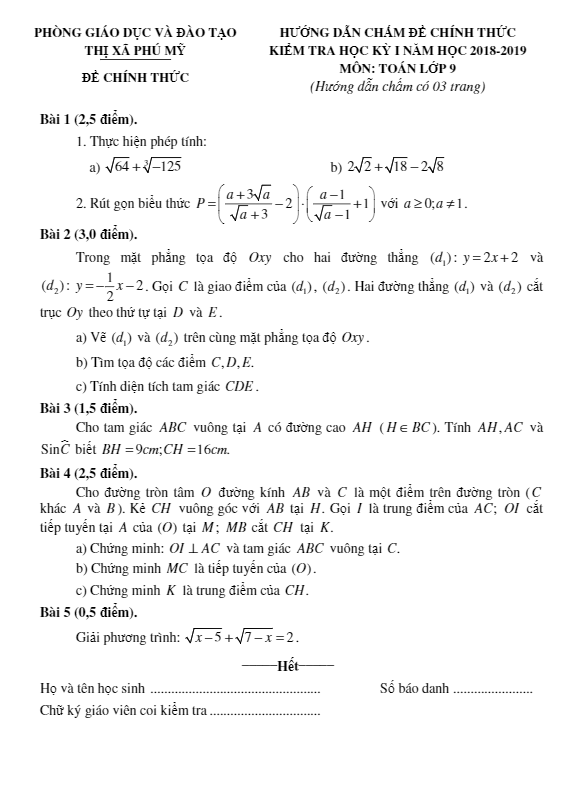 Đề Thi HK1 Toán 9 Đề thi HK1 Toán 9 năm 2018 – 2019 phòng GD&ĐT Thị Xã Phú Mỹ – Bà Rịa – Vũng Tàu 25/12/2018
