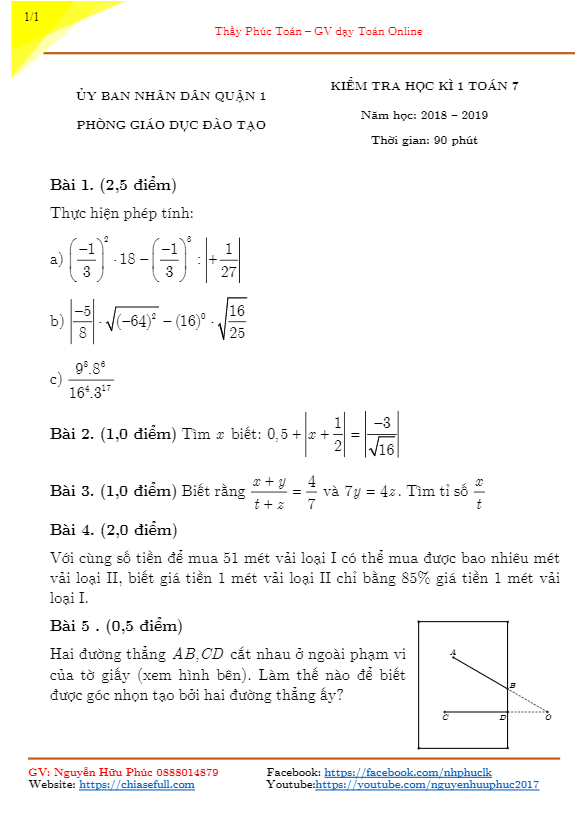 Đề Thi HK1 Toán 7 Đề thi học kỳ 1 Toán 7 năm học 2018 – 2019 phòng GD&ĐT Quận 12 – TP. HCM 20/12/2018