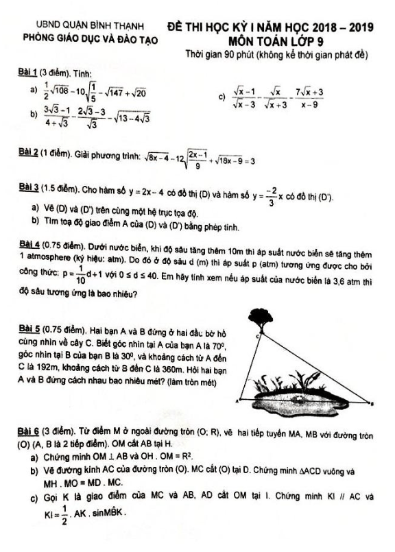 Đề Thi HK1 Toán 9 Đề thi học kỳ 1 Toán 9 năm học 2018 – 2019 phòng GD và ĐT Bình Thạnh – TP. HCM 18/12/2018