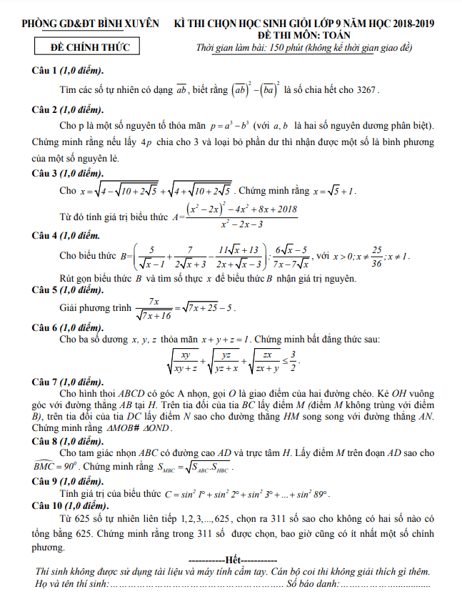 Đề Thi HSG Toán 9 Đề thi học sinh giỏi Toán 9 năm 2018 – 2019 phòng GD&ĐT Bình Xuyên – Vĩnh Phúc 26/12/2018