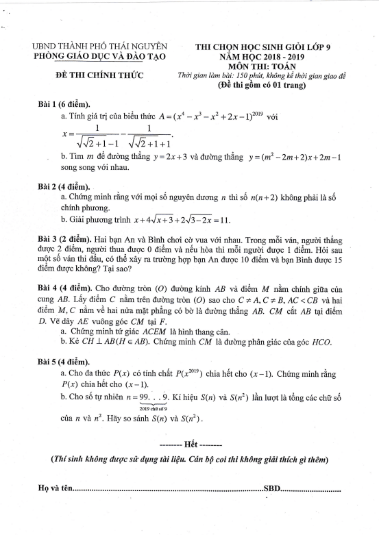 Đề Thi HSG Toán 8 Đề giao lưu học sinh giỏi Toán 8 năm 2018 – 2019 phòng GD&ĐT thành phố Thái Nguyên 25/12/2018