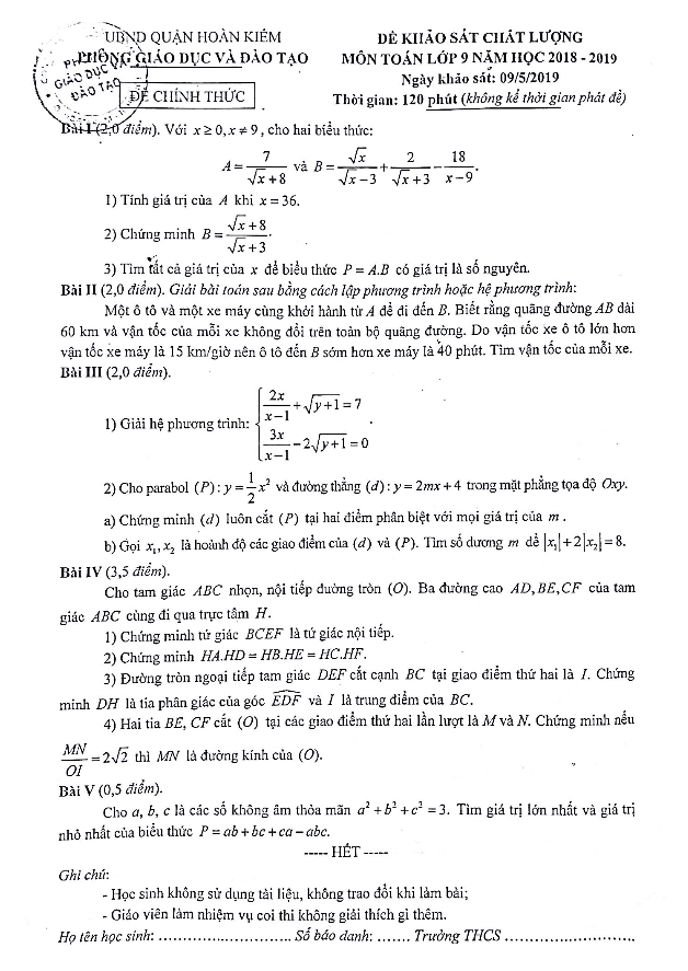 Khảo Sát Chất Lượng Toán 9 Đề khảo sát Toán 9 năm 2018 – 2019 phòng GD&ĐT Hoàn Kiếm – Hà Nội 10/05/2019