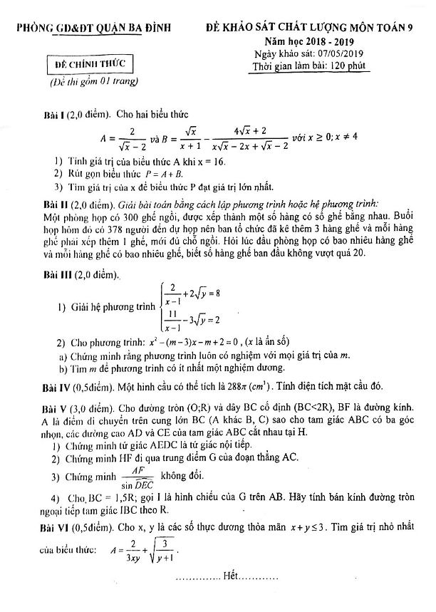 Khảo Sát Chất Lượng Toán 9 Đề khảo sát chất lượng Toán 9 năm 2018 – 2019 phòng GD&ĐT Ba Đình – Hà Nội 08/05/2019