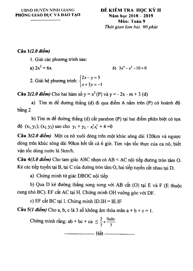 Đề Thi HK2 Toán 9 Đề kiểm tra chất lượng cuối năm Toán 9 năm 2018 – 2019 sở GD&ĐT Bắc Ninh 09/05/2019