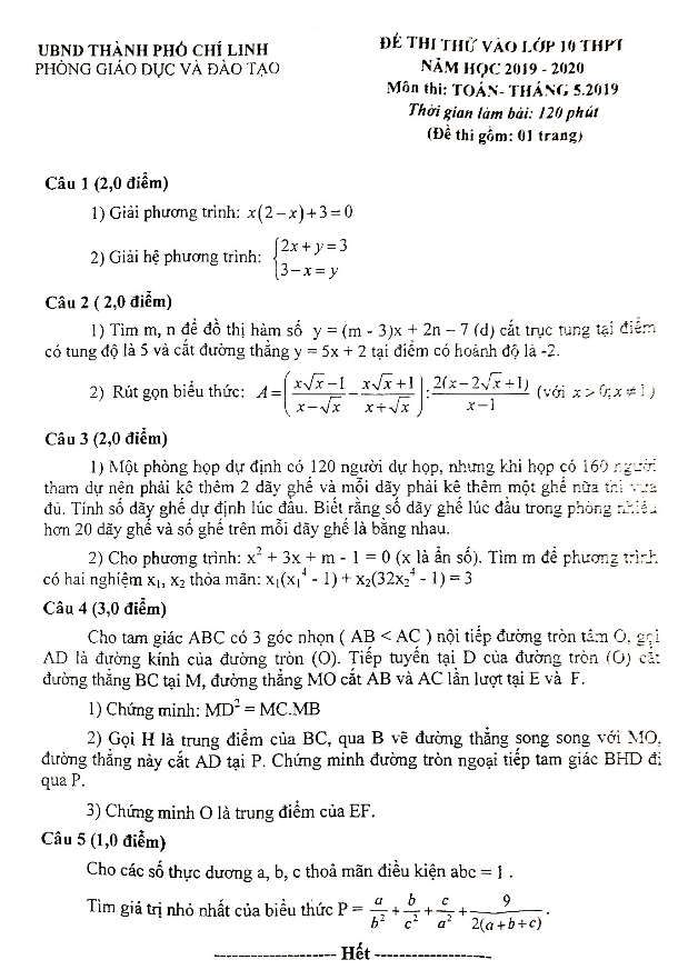 Đề Thi Tuyển Sinh Lớp 10 Môn Toán Đề thi thử Toán vào lớp 10 năm 2019 – 2020 phòng GD&ĐT Chí Linh – Hải Dương 09/05/2019