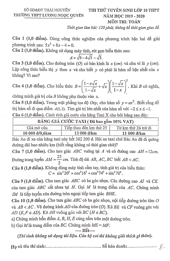 Đề Thi Tuyển Sinh Lớp 10 Môn Toán Đề thi thử Toán vào lớp 10 năm 2019 – 2020 trường Lương Ngọc Quyến – Thái Nguyên 08/05/2019