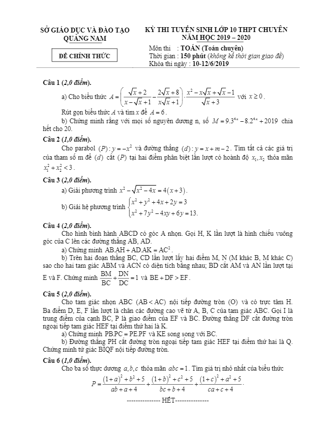 Đề Thi Tuyển Sinh Lớp 10 Môn Toán Đề tuyển sinh lớp 10 năm 2019 – 2020 môn Toán sở GD&ĐT Quảng Nam (chuyên Toán) 08/07/2019