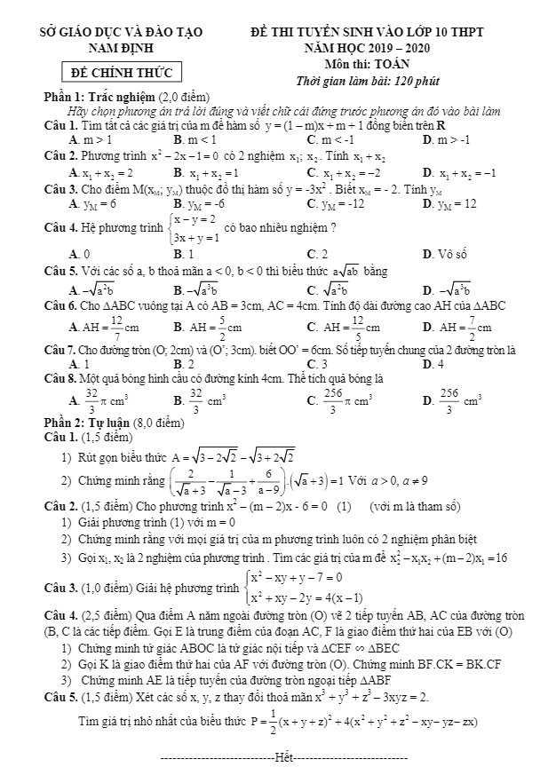 Đề Thi Tuyển Sinh Lớp 10 Môn Toán Đề tuyển sinh lớp 10 THPT năm 2019 – 2020 môn Toán sở GD&ĐT Nam Định 08/07/2019