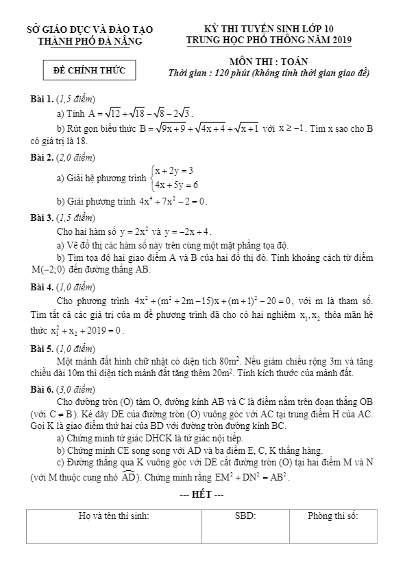 Đề Thi Tuyển Sinh Lớp 10 Môn Toán Đề tuyển sinh lớp 10 THPT năm 2019 môn Toán sở GD&ĐT Đà Nẵng 08/07/2019