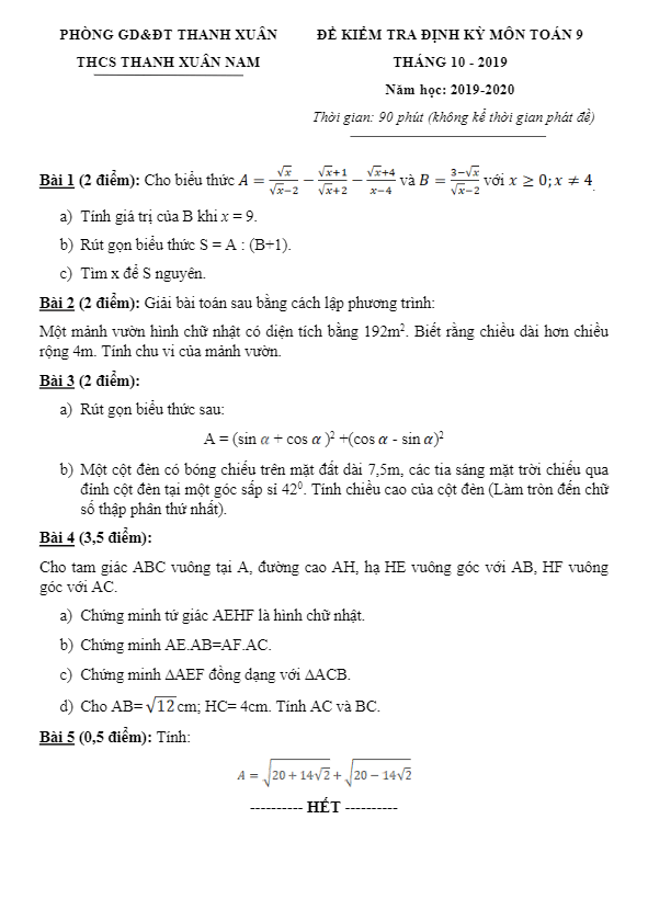 Khảo Sát Chất Lượng Toán 9 Đề kiểm tra định kỳ Toán 9 tháng 10/2019 trường Thanh Xuân Nam – Hà Nội 19/10/2019