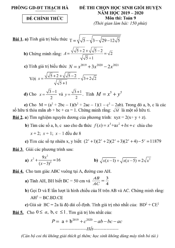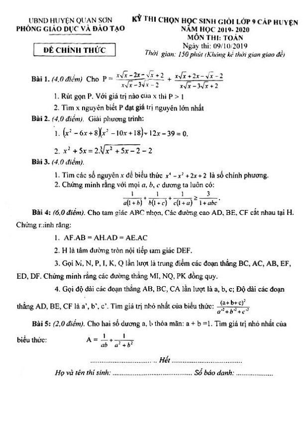 Đề Thi HSG Toán 9 Đề thi chọn HSG huyện Toán 9 năm 2019 – 2020 phòng GD&ĐT Quan Sơn – Thanh Hóa 23/10/2019
