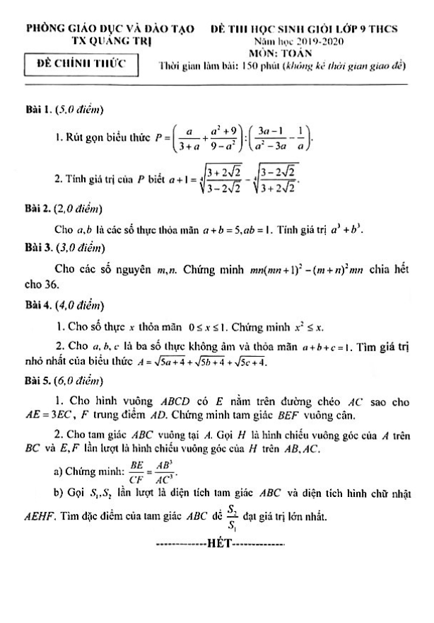 Đề Thi HSG Toán 9 Đề thi học sinh giỏi Toán 9 năm 2019 – 2020 phòng GD&ĐT Thị xã Quảng Trị 23/10/2019