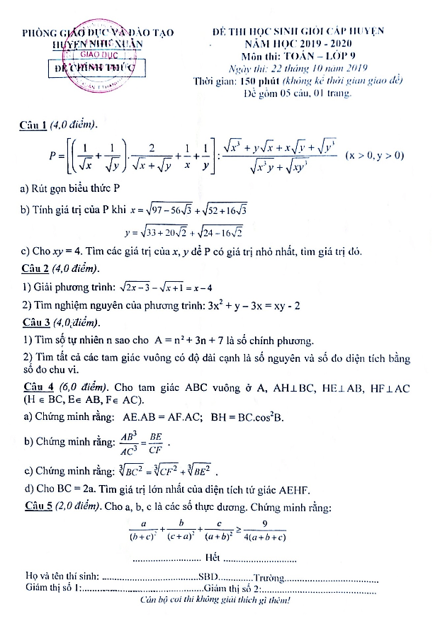 Đề Thi HSG Toán 9 Đề thi HSG cấp huyện Toán 9 năm 2019 – 2020 phòng GD&ĐT Như Xuân – Thanh Hoá 23/10/2019