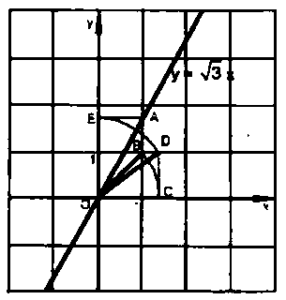 Ví dụ 4: Đồ thị hàm số $y = \sqrt 3 x$ được vẽ bằng thước và compa như ở hình vẽ sau. Hãy tìm hiểu và trình bày lại các bước thực hiện đó.