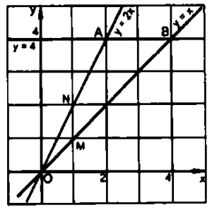 b) Đường thẳng $y = 4$ lần lượt cắt các đường thẳng $y = 2x$, $y = x$ tại điểm $A$ và $B.$ Tìm toạ độ các điểm $A$ và $B$ và tính chu vi, diện tích của tam giác $ОАВ.$