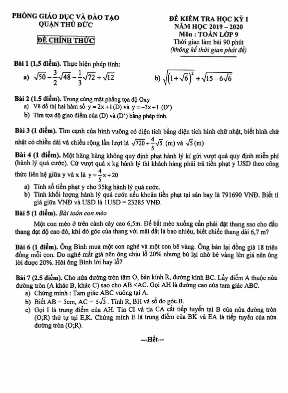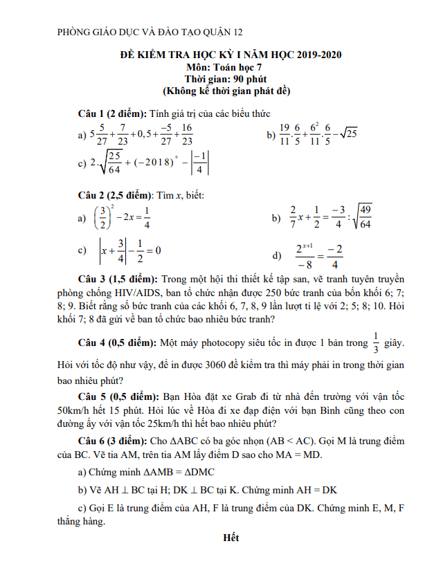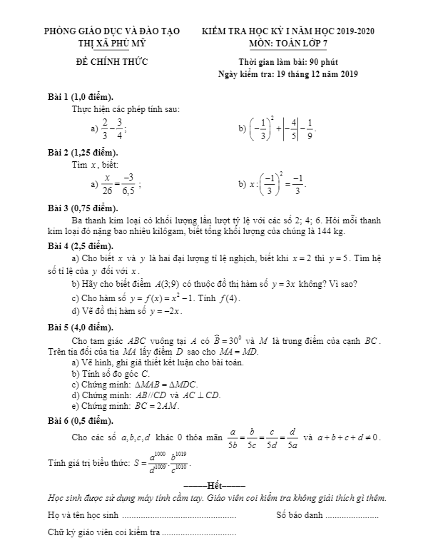 Đề Thi HK1 Toán 7 Đề thi học kỳ 1 Toán 7 năm 2019 – 2020 phòng GD&ĐT Bình Xuyên – Vĩnh Phúc 26/12/2019
