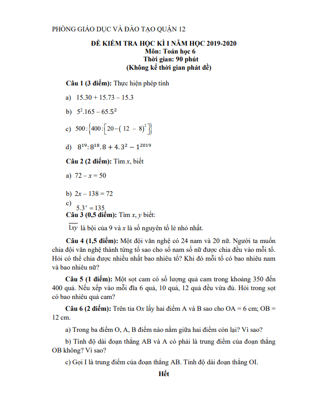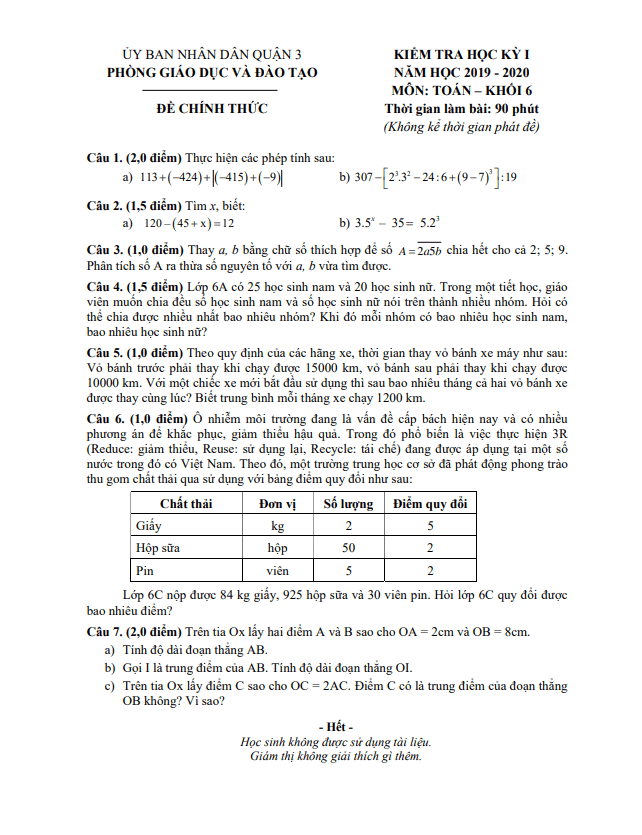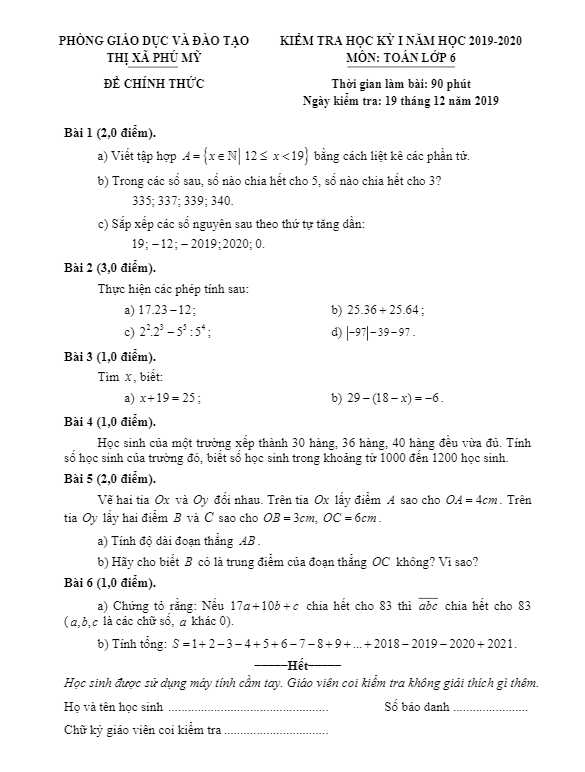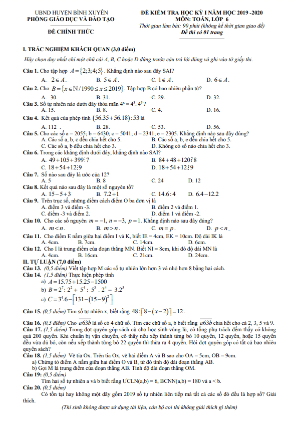 Đề Thi HK1 Toán 6 Đề thi học kỳ 1 Toán 6 năm 2019 – 2020 phòng GD&ĐT Bình Xuyên – Vĩnh Phúc 26/12/2019