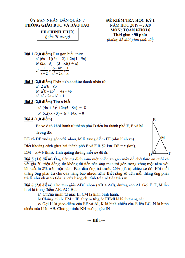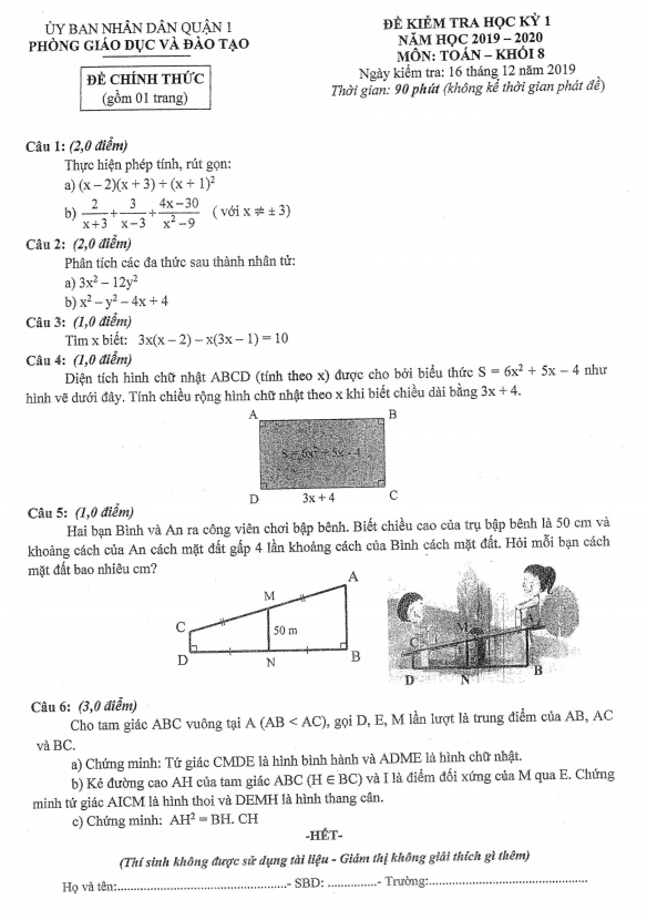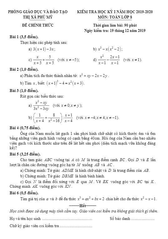 Đề Thi HK1 Toán 8 Đề thi học kỳ 1 Toán 8 năm 2019 – 2020 phòng GD&ĐT Bình Xuyên – Vĩnh Phúc 26/12/2019