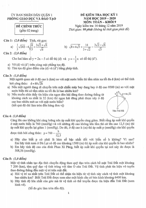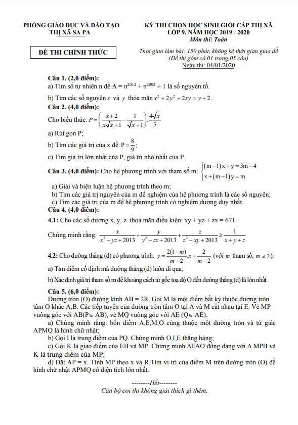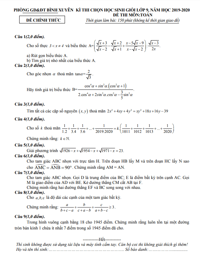 Đề Thi HSG Toán 9 Đề thi học sinh giỏi Toán 9 năm 2019 – 2020 phòng GD&ĐT Bình Xuyên – Vĩnh Phúc 26/12/2019