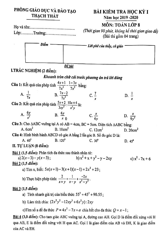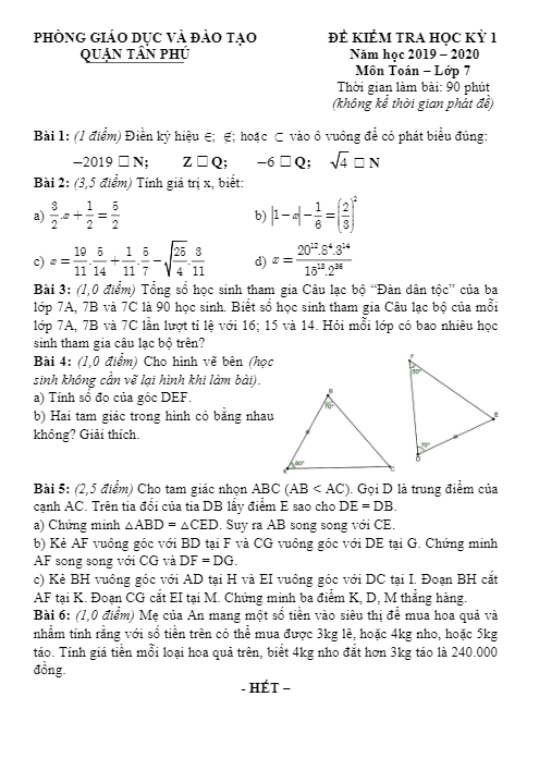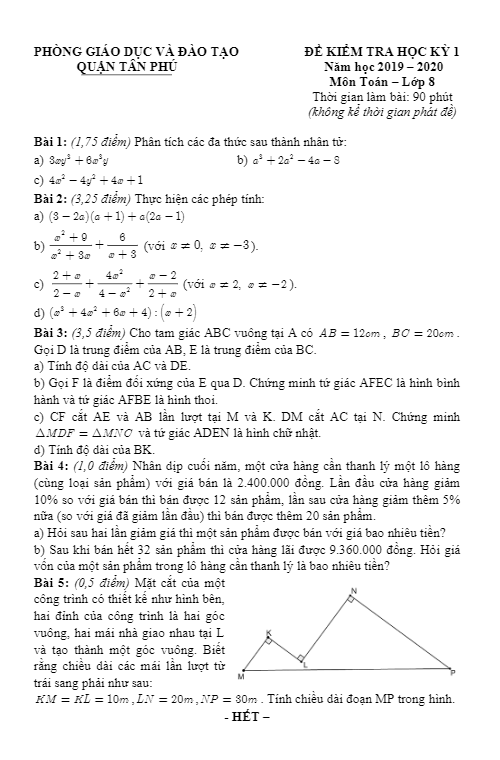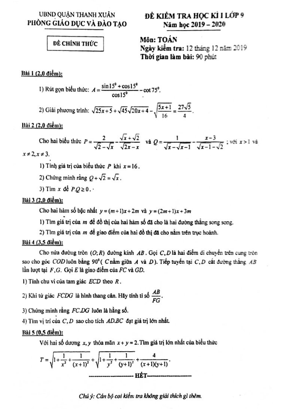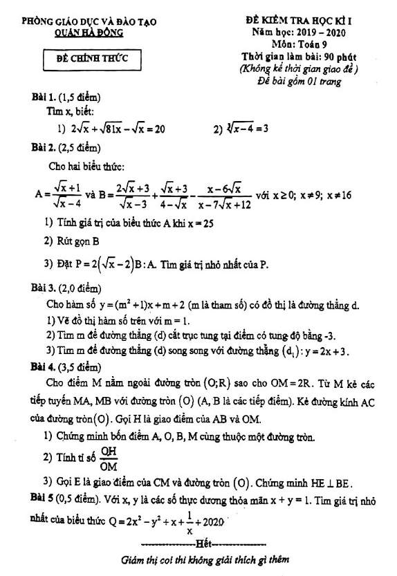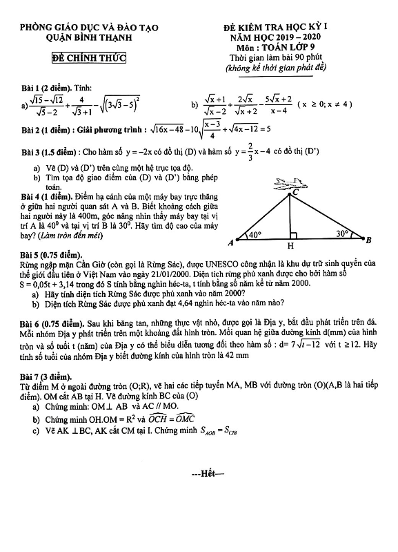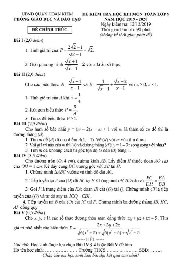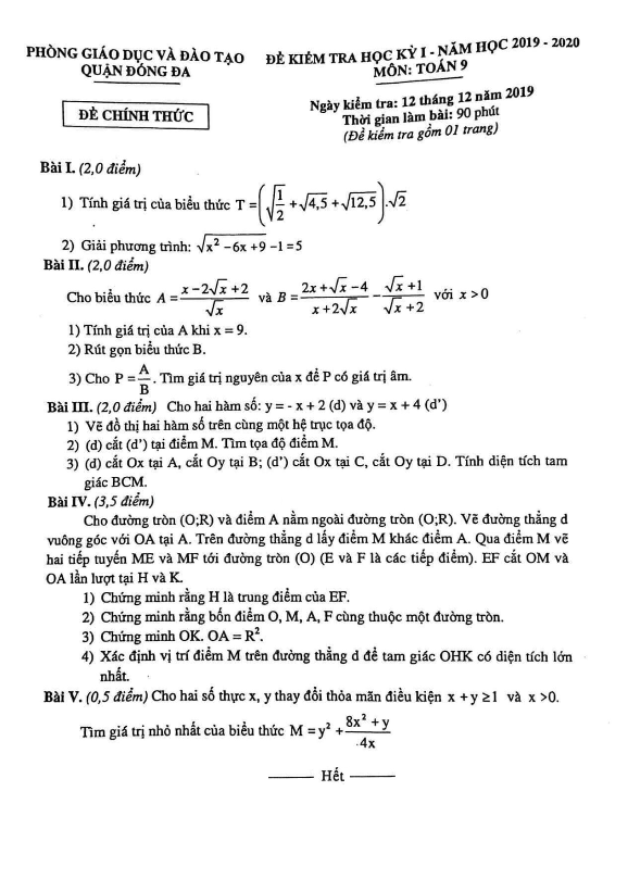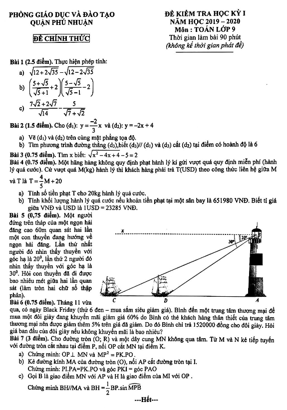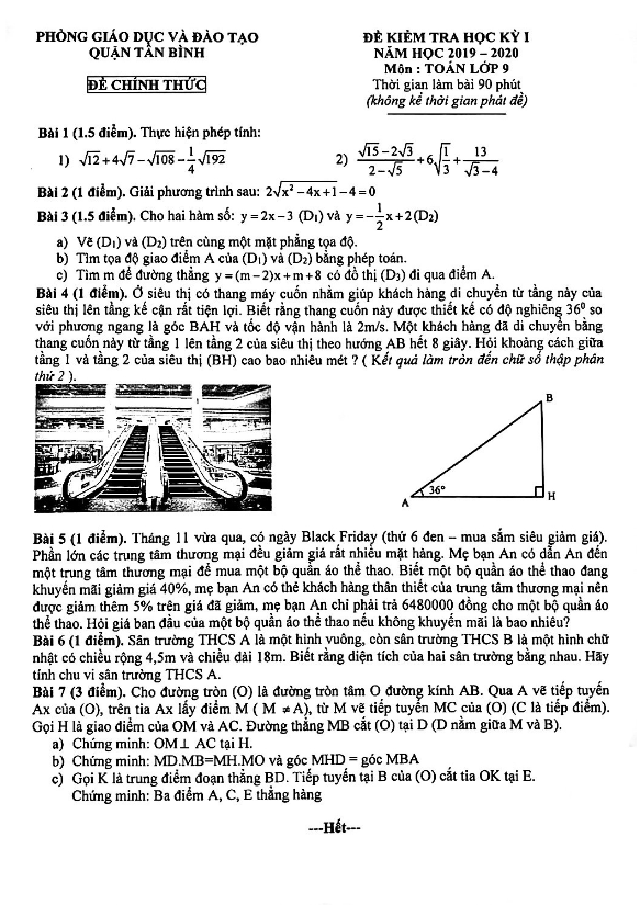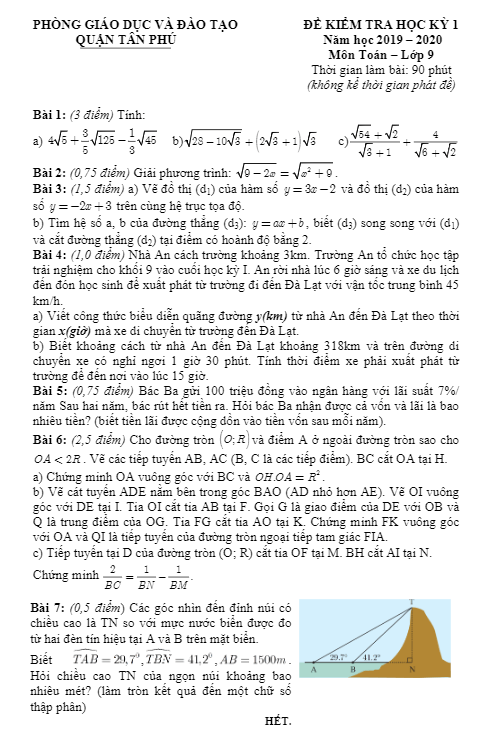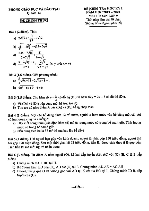 Đề Thi HK1 Toán 9 Đề kiểm tra học kỳ 1 Toán 9 năm 2019 – 2020 phòng GD&ĐT Quận 12 – TP HCM 18/12/2019