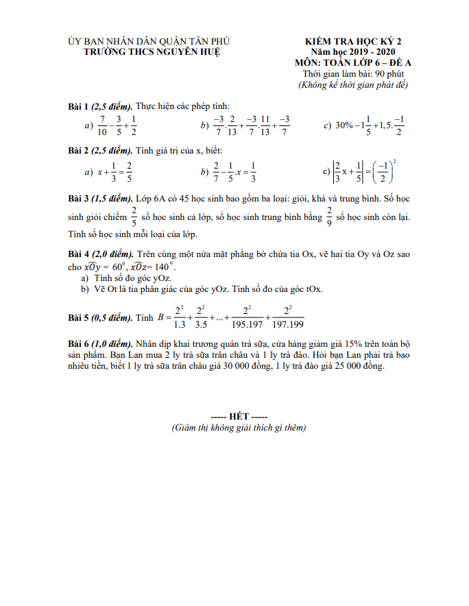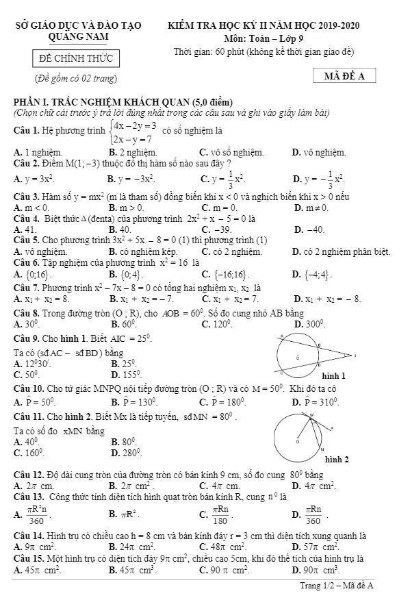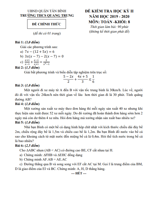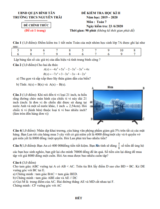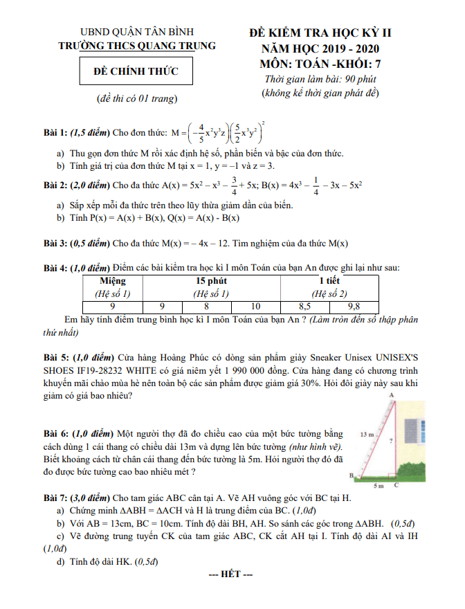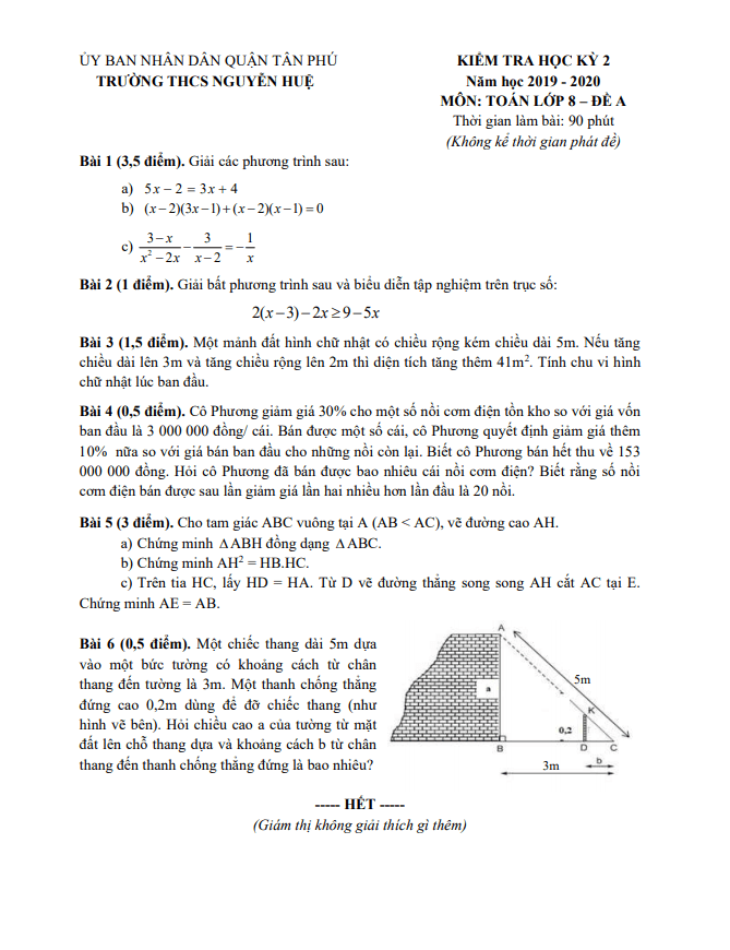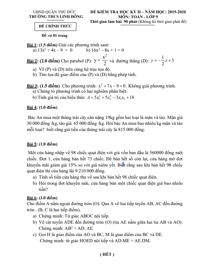 Khảo Sát Chất Lượng Toán 9 Đề KSCL Toán 9 năm học 2019 – 2020 trường THCS Lê Ngọc Hân – Hà Nội 30/06/2020