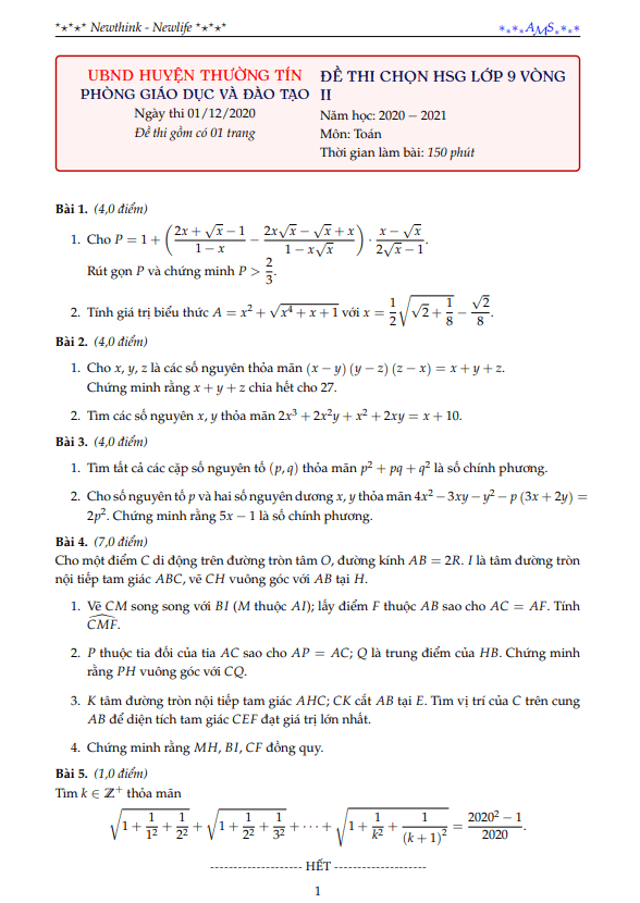 Đề Thi HSG Toán 9 Đề chọn HSG Toán 9 vòng 2 năm 2020 – 2021 phòng GD&ĐT Thường Tín – Hà Nội 04/12/2020