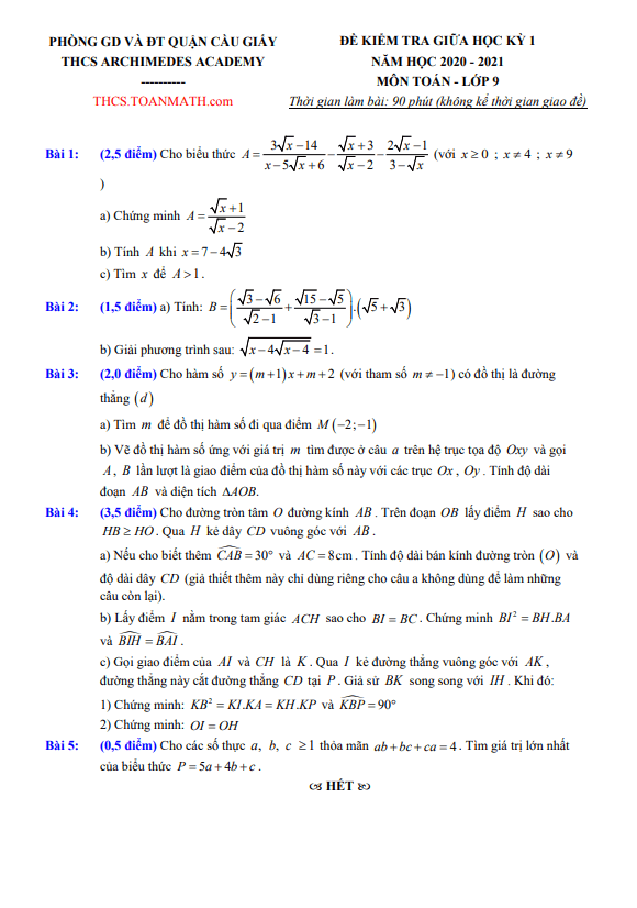 Đề Thi Giữa HK1 Toán 9 Đề thi giữa kì 1 Toán 9 năm 2020 – 2021 trường THCS Archimedes Academy – Hà Nội 09/12/2020
