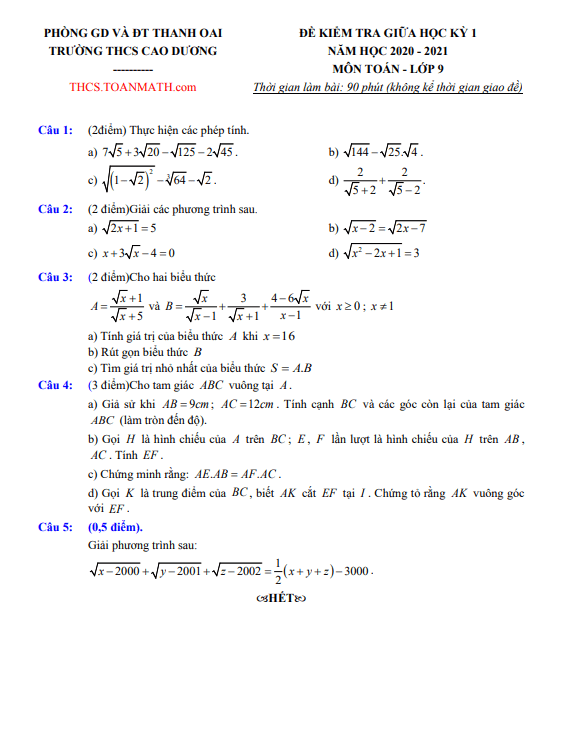 Đề Thi Giữa HK1 Toán 9 Đề thi giữa kì 1 Toán 9 năm 2020 – 2021 trường THCS Cao Dương – Hà Nội 09/12/2020