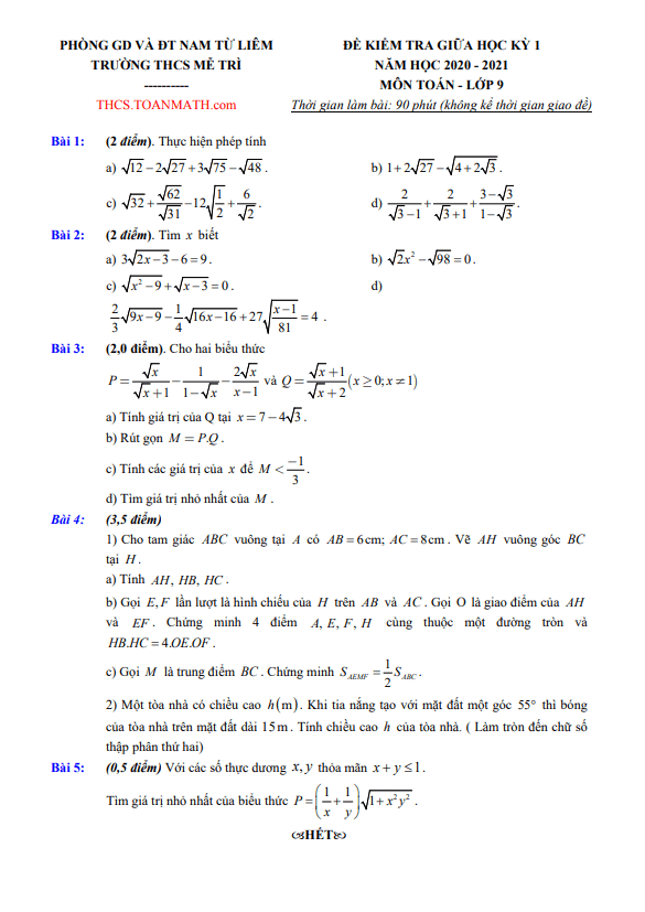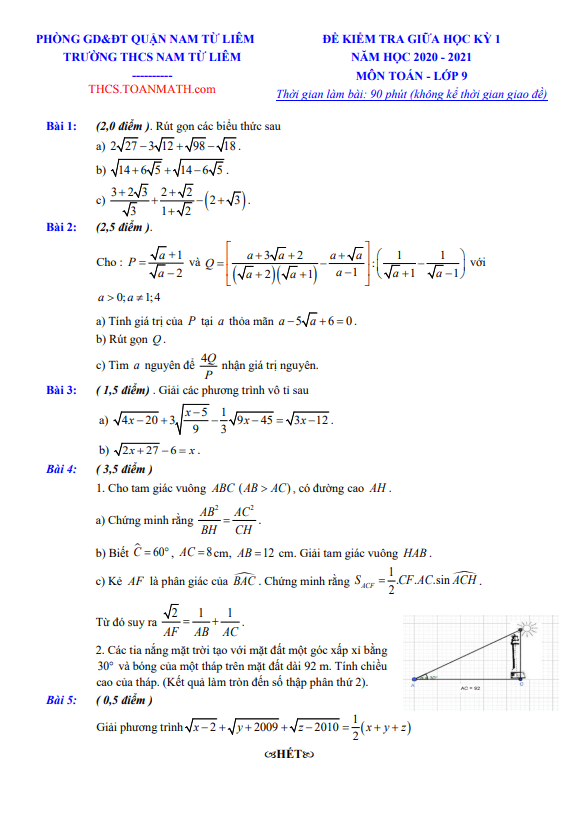 Đề Thi Giữa HK1 Toán 9 Đề thi giữa kì 1 Toán 9 năm 2020 – 2021 trường THCS Nam Từ Liêm – Hà Nội 09/12/2020