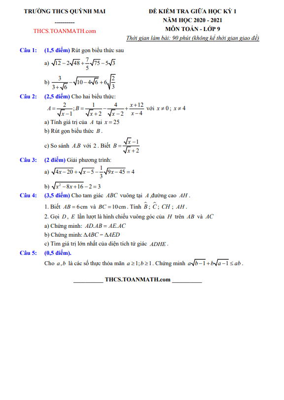 Đề Thi Giữa HK1 Toán 9 Đề thi giữa kì 1 Toán 9 năm 2020 – 2021 trường THCS Quỳnh Mai – Hà Nội 09/12/2020