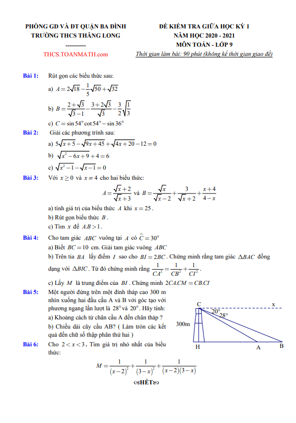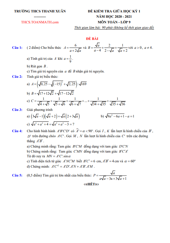 Đề Thi Giữa HK1 Toán 9 Đề thi giữa kì 1 Toán 9 năm 2020 – 2021 trường THCS Thanh Xuân – Hà Nội 09/12/2020