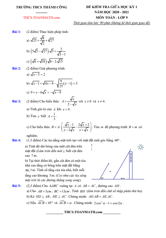 Đề Thi Giữa HK1 Toán 9 Đề thi giữa kì 1 Toán 9 năm 2020 – 2021 trường THCS Thành Công – Hà Nội 09/12/2020