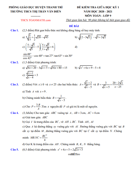 Đề Thi Giữa HK1 Toán 9 Đề thi giữa kì 1 Toán 9 năm 2020 – 2021 trường THCS thị trấn Văn Điển – Hà Nội 09/12/2020